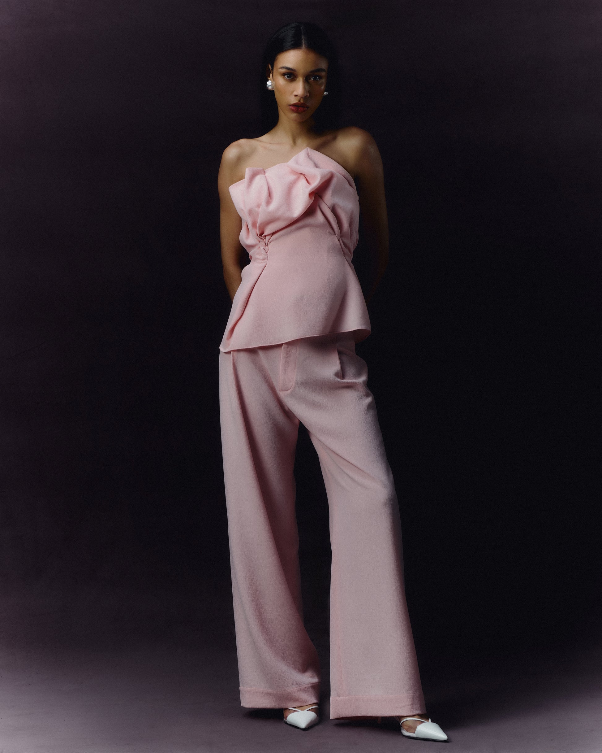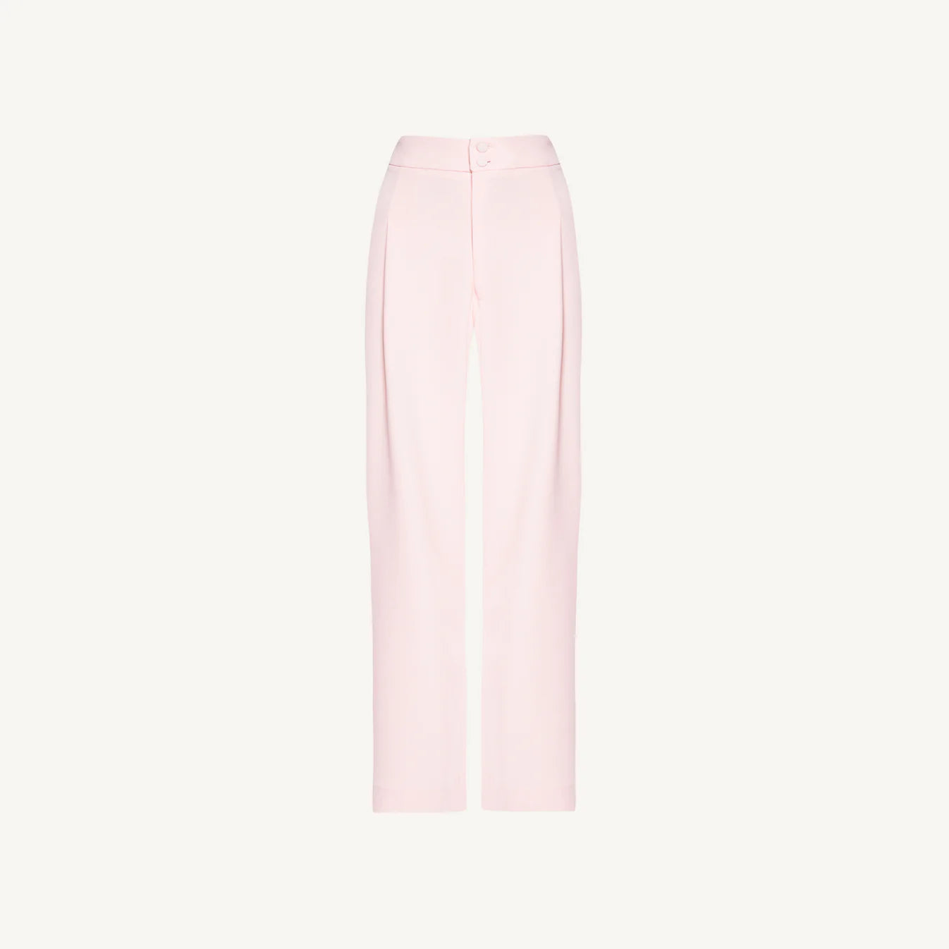 A Calça Cura possui modelagem que encaixa no corpo, é confeccionada em crepe texturizado, possui shape reto, pregas frontais e fechamento por zíper Ykk e botão forrado