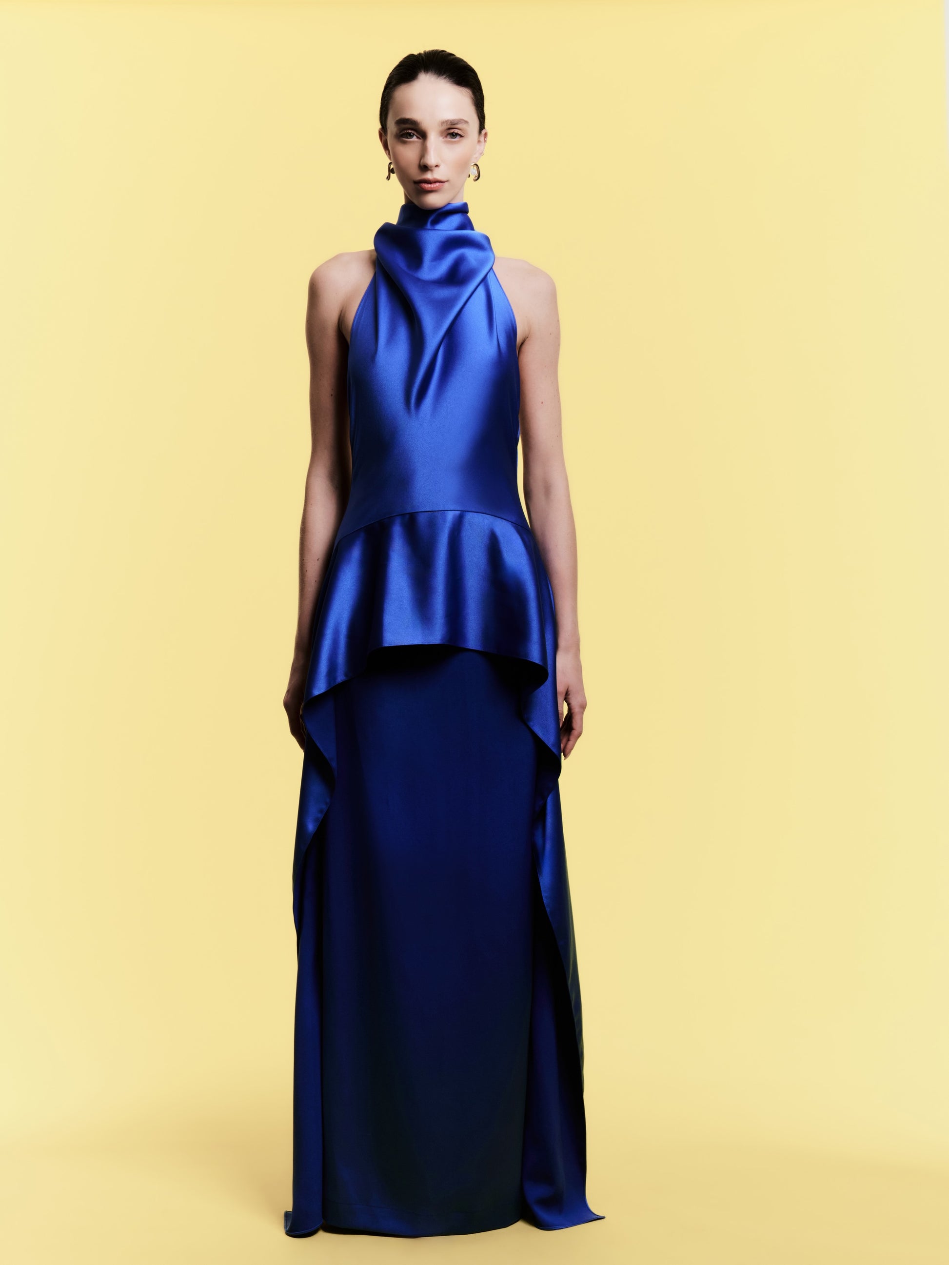 Além do que se espera de um vestido de festa, o Vestido Além é movimento de todos os ângulos. Suas costas decotadas e gola alta sublinham a beleza de quem o veste.