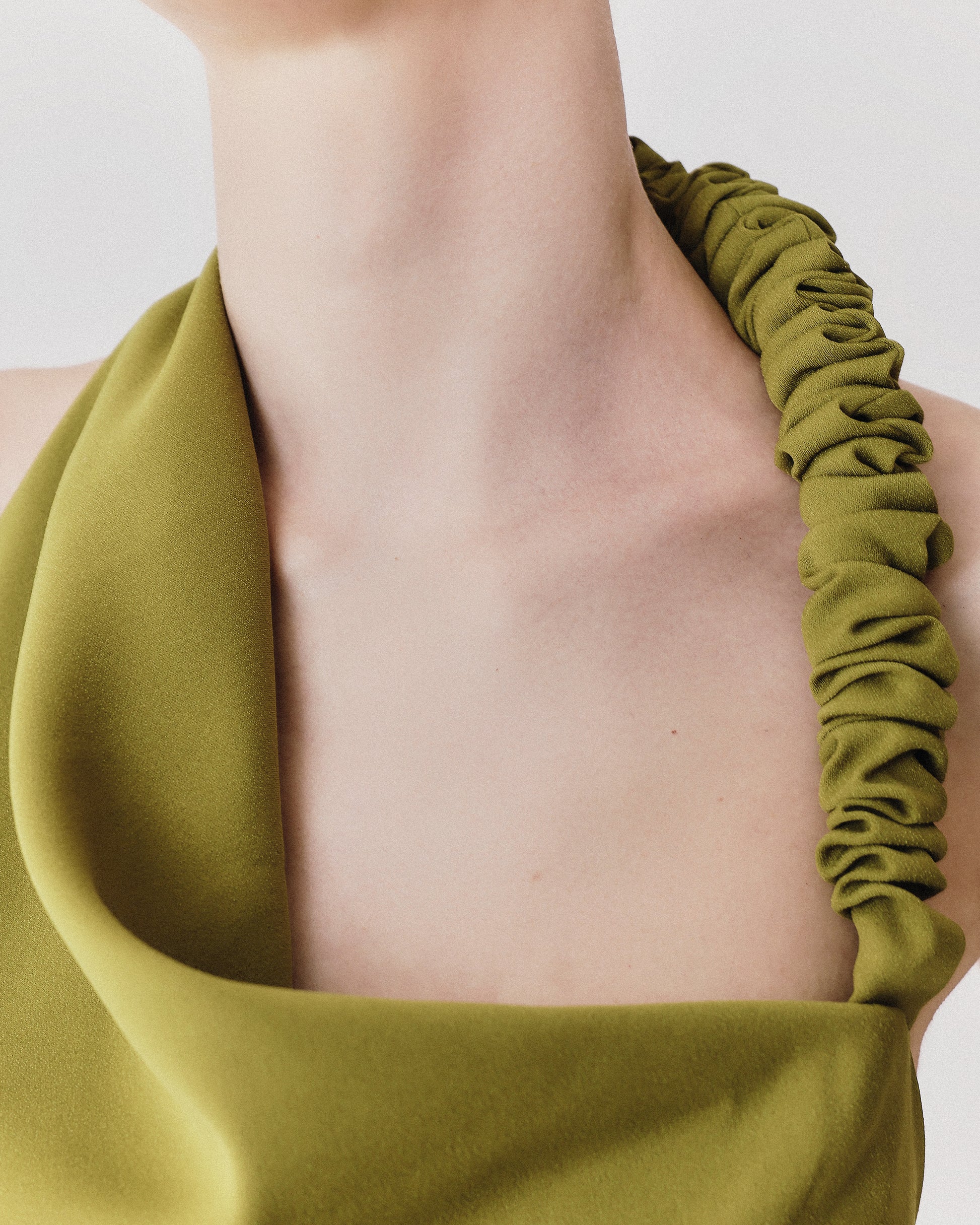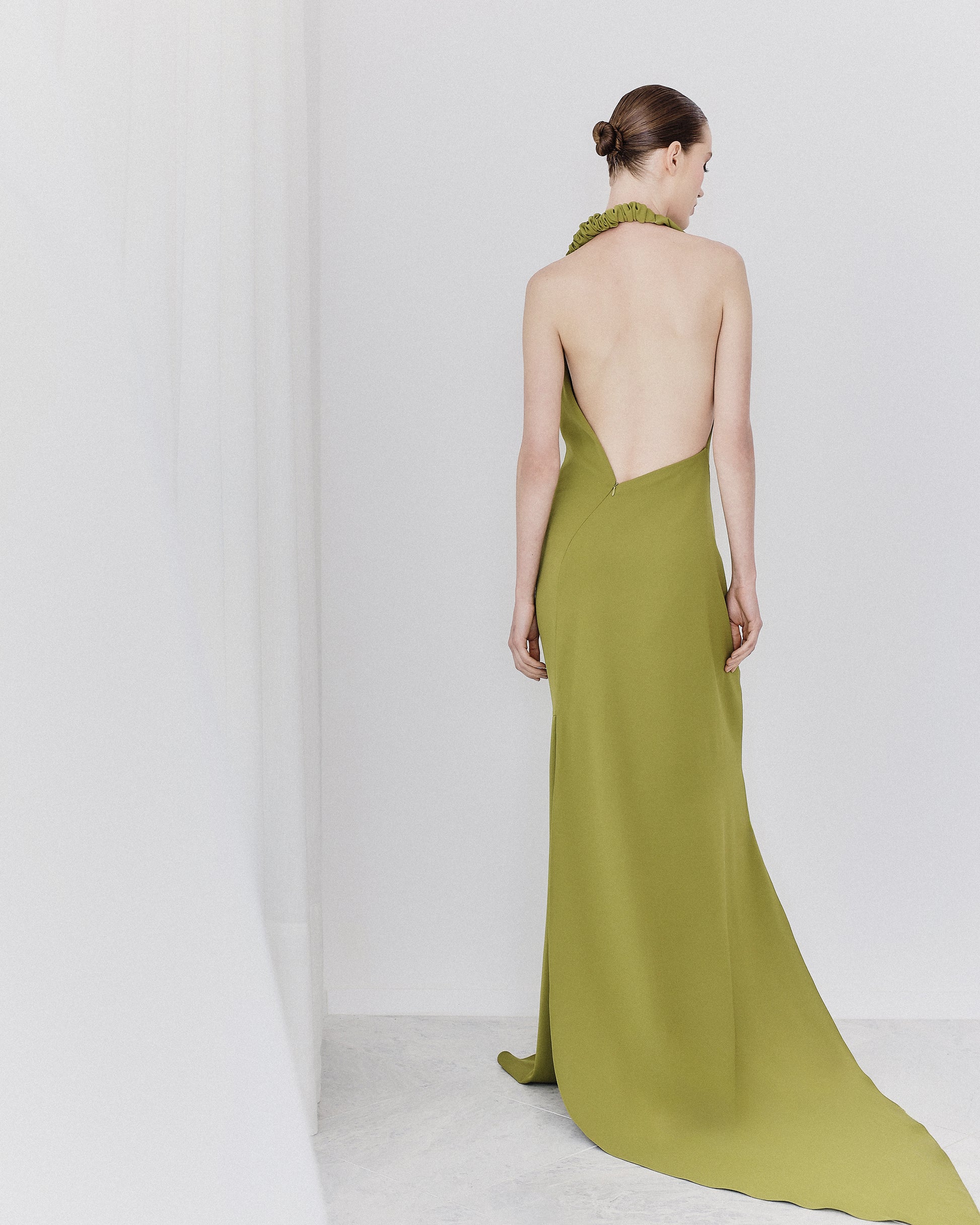 - Fechamento por zíper invisível na diagonal das costas da peça;