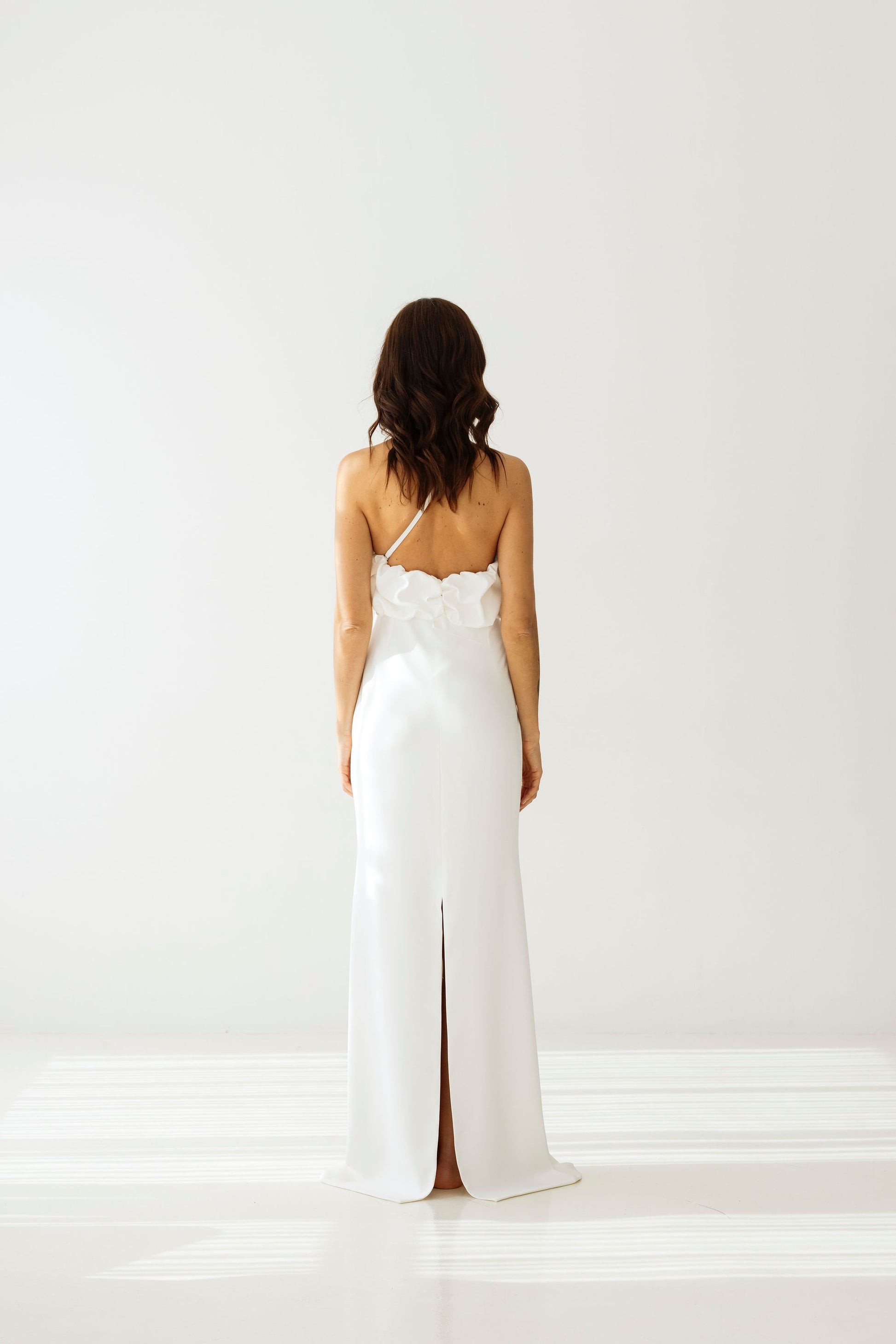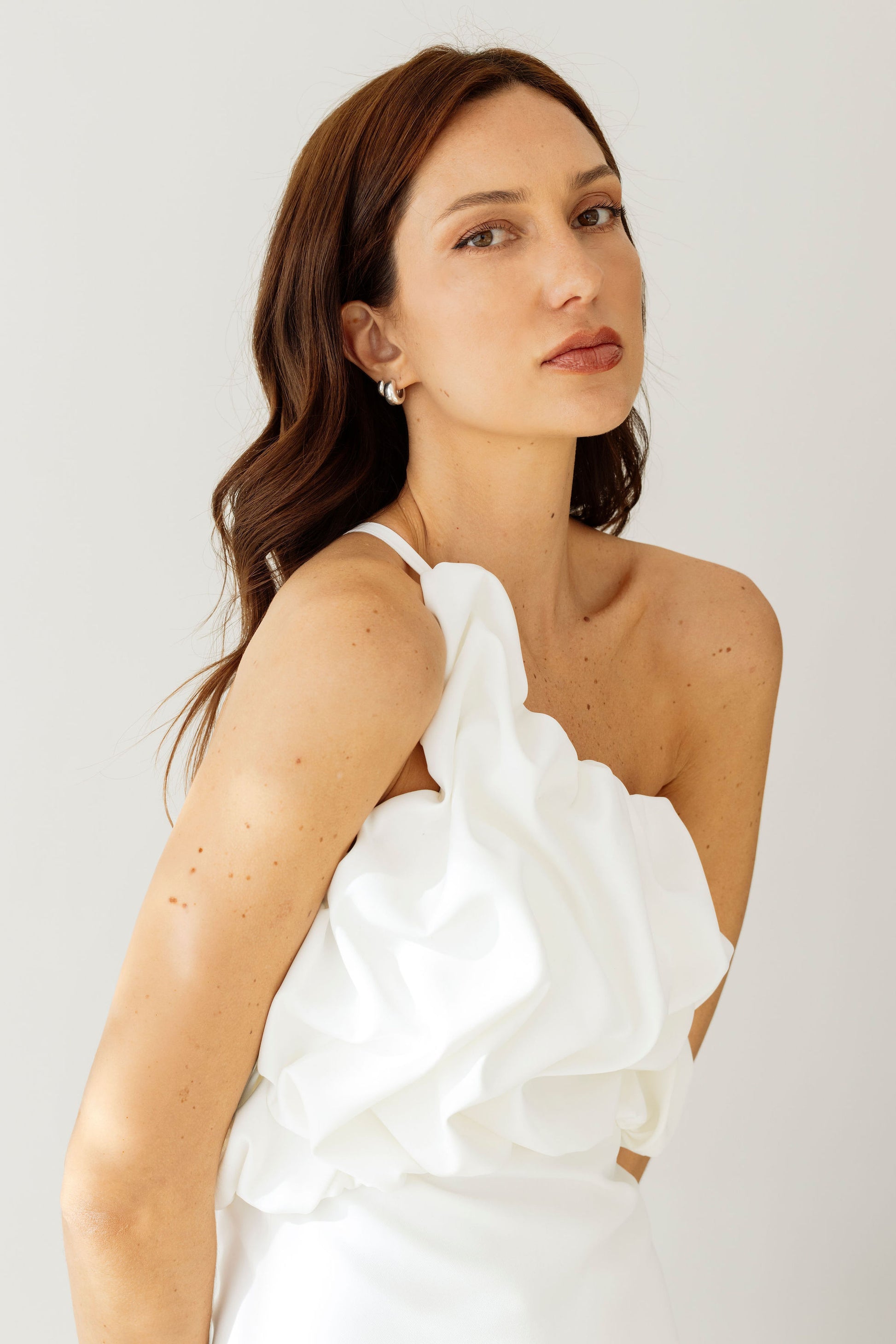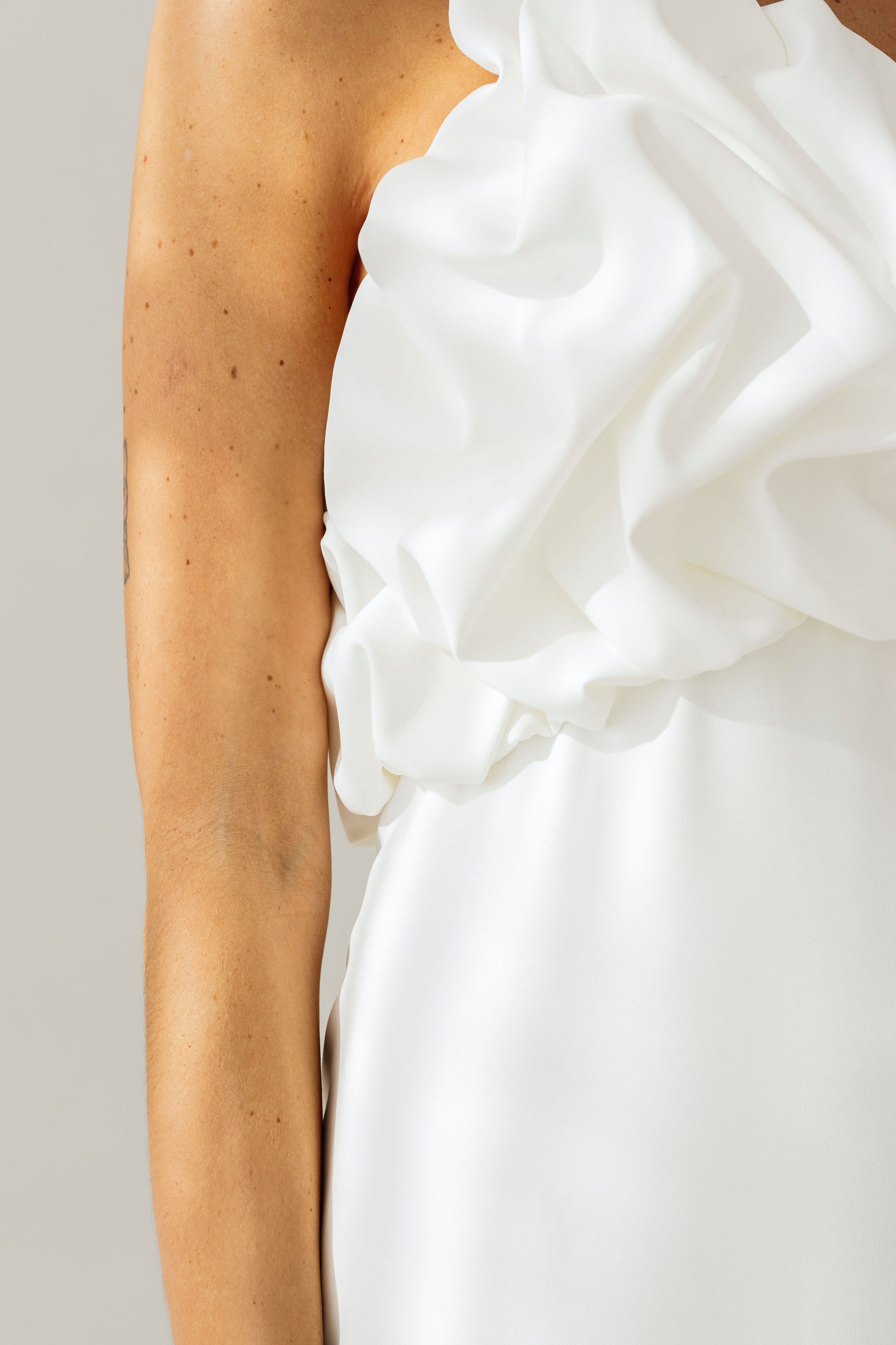 Essa peça única, texturizada e etérea rouba o foco, os olhares e os maiores elogios em qualquer ambiente por onde passa. O busto é esculpido por pontos manuais e meticulosos que trazem volume e assimetria ao look. A maior beleza do vestido mora no contraste entre este busto volumoso e a modelagem acinturada e ajustada da peça. O toque de sensualidade é evidenciado pelas costas decotadas, enquanto as longas fendas na saia adicionam um elemento de provocação ao vestido.