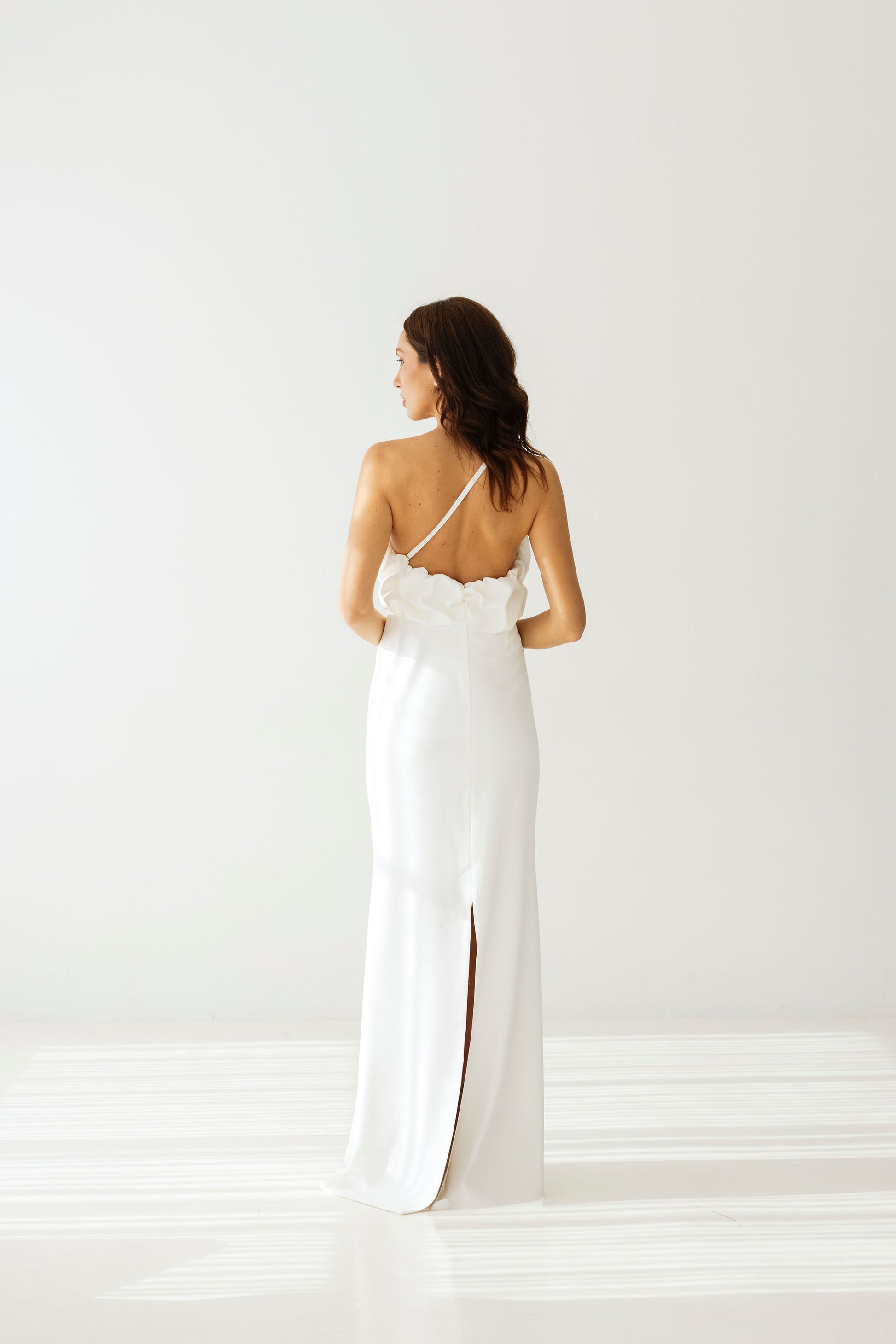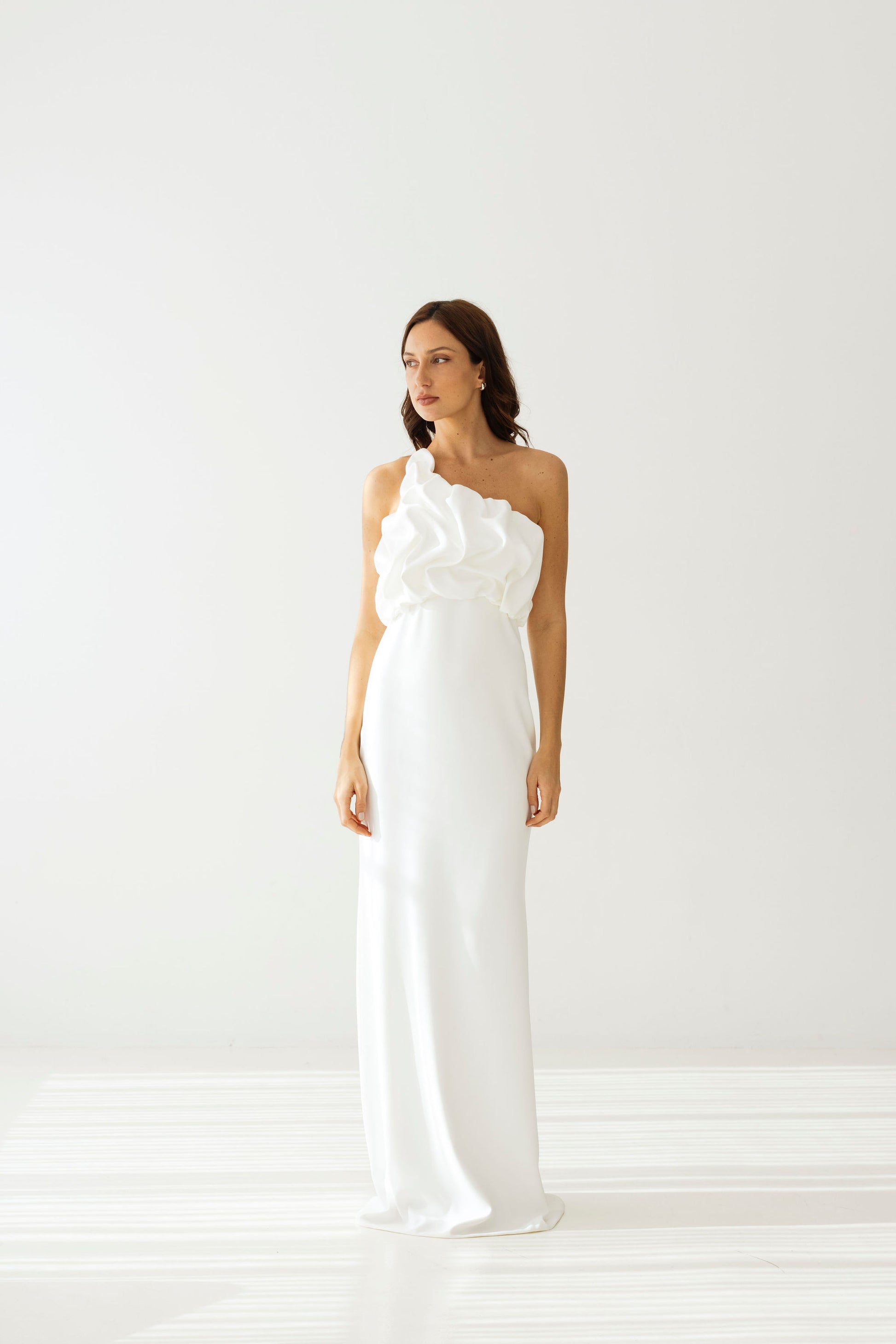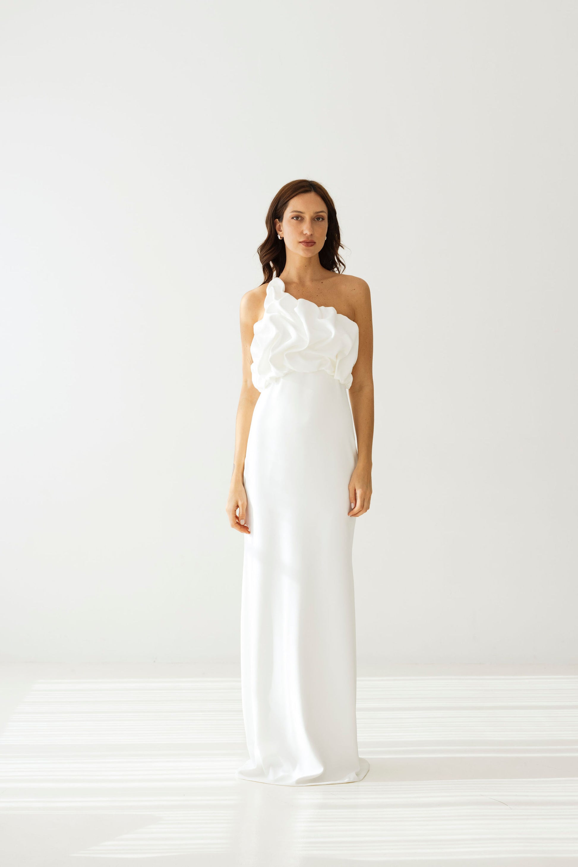 Essa peça única, texturizada e etérea rouba o foco, os olhares e os maiores elogios em qualquer ambiente por onde passa. O busto é esculpido por pontos manuais e meticulosos que trazem volume e assimetria ao look. A maior beleza do vestido mora no contraste entre este busto volumoso e a modelagem acinturada e ajustada da peça. O toque de sensualidade é evidenciado pelas costas decotadas, enquanto as longas fendas na saia adicionam um elemento de provocação ao vestido.