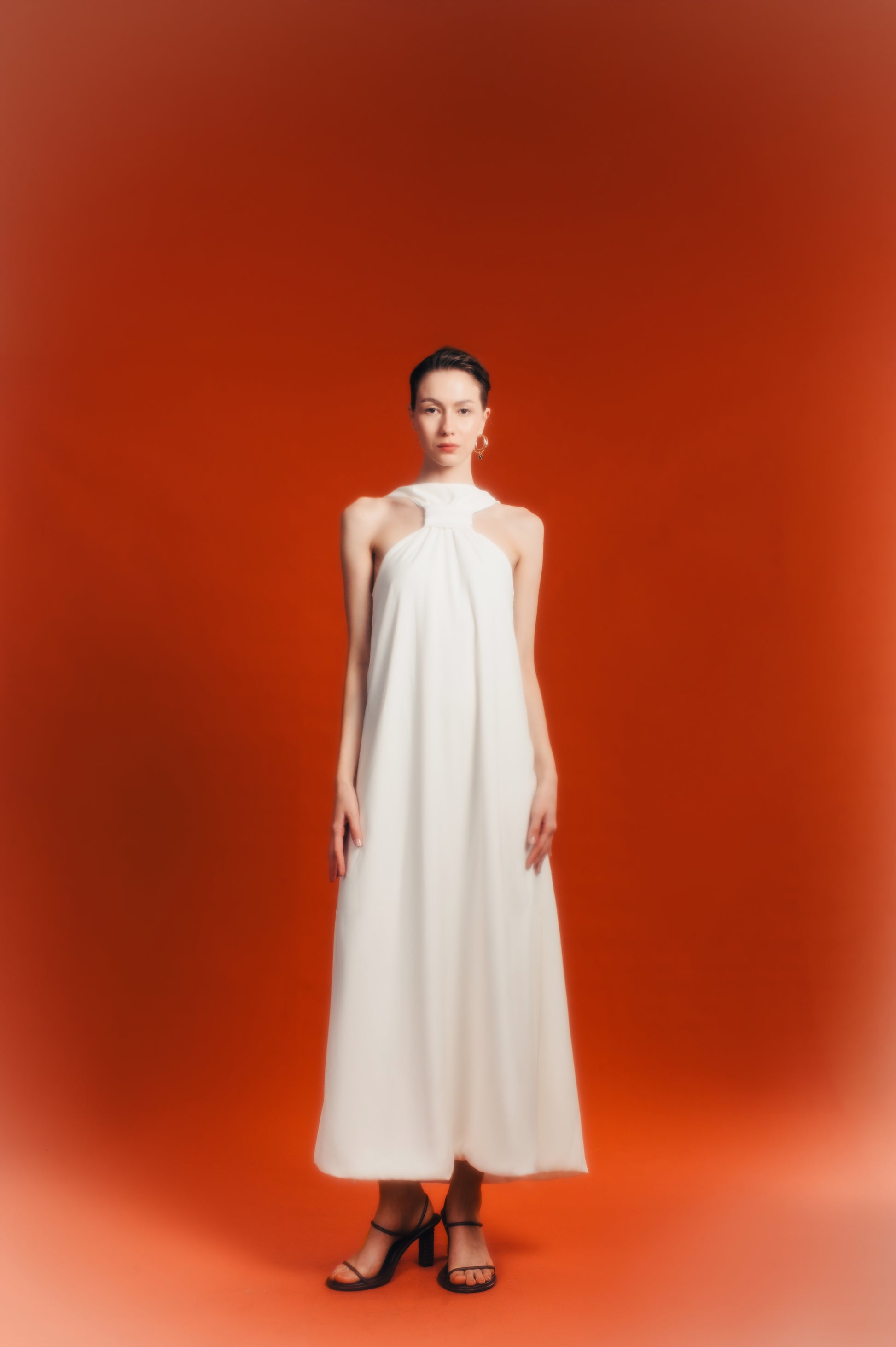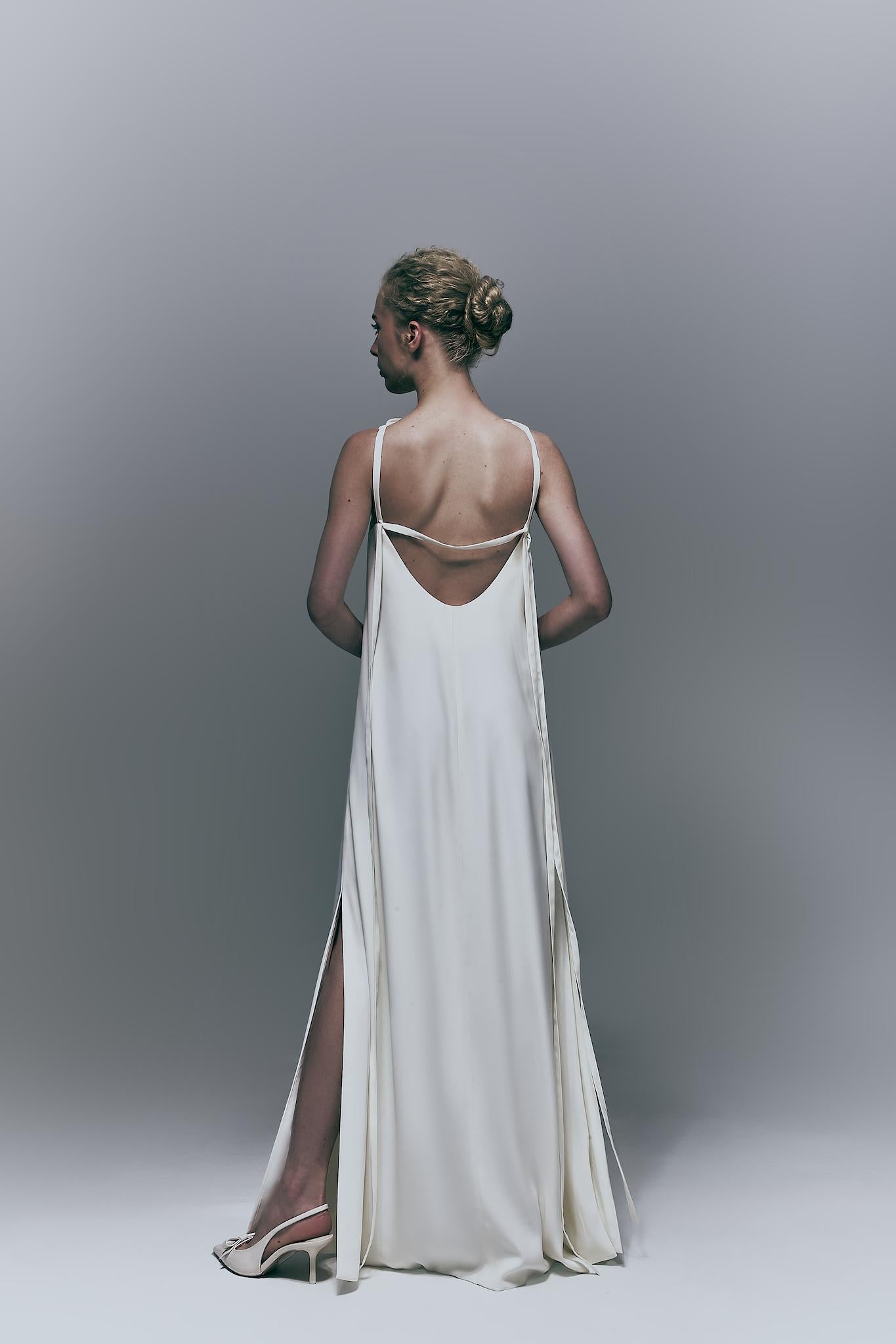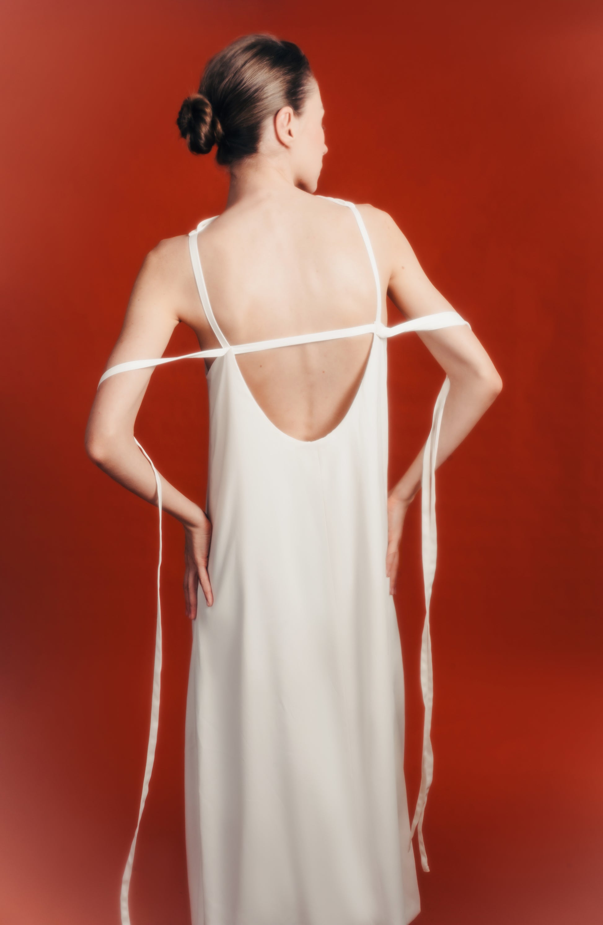 Esse vestido conta com uma gola proeminente em formato de leque e com costas abertas e tiras alongadas que ultrapassam o comprimento do vestido, trazendo ainda mais movimento e atipicidade à peça.
