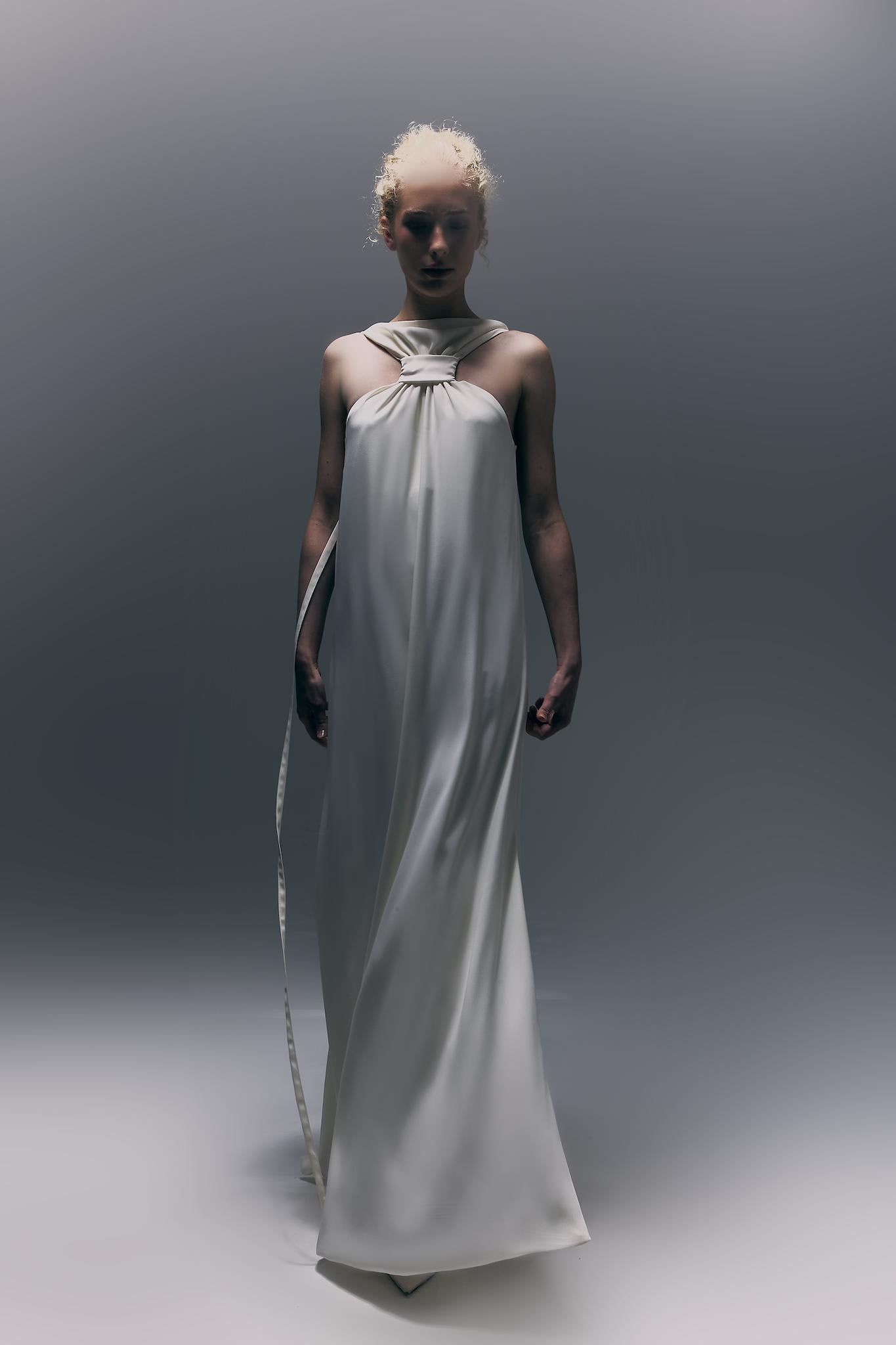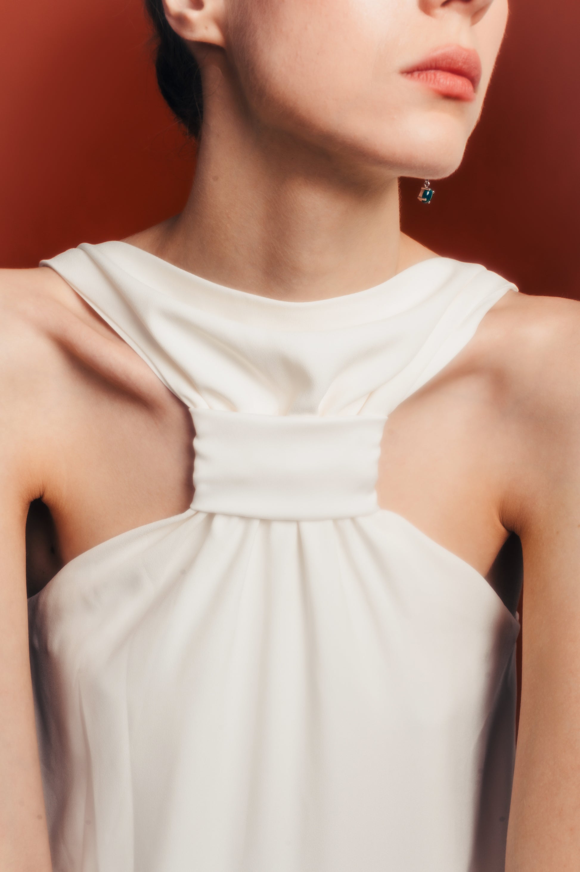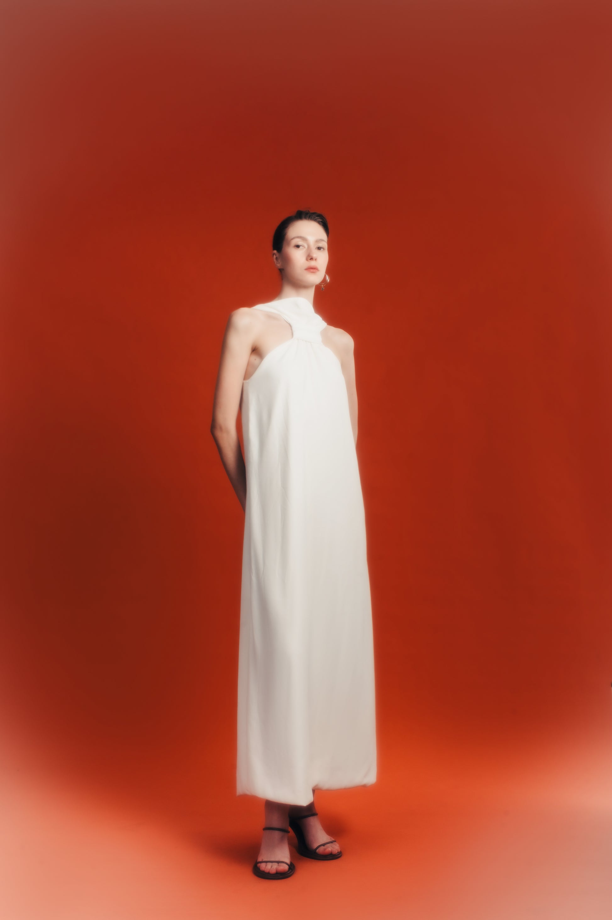 Esse vestido conta com uma gola proeminente em formato de leque e com costas abertas e tiras alongadas que ultrapassam o comprimento do vestido, trazendo ainda mais movimento e atipicidade à peça.